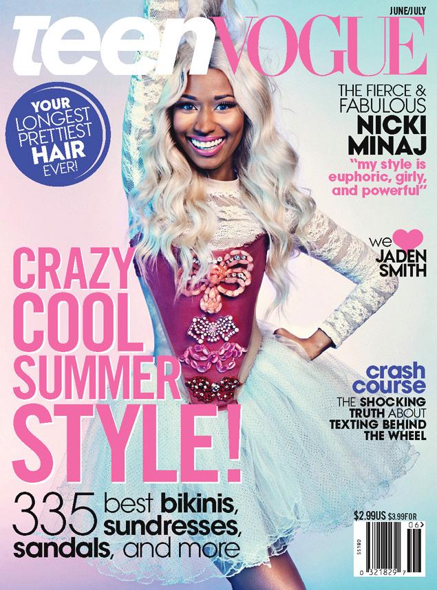 The 30 year old rapper/designer/American Idol Judge brings her signature “Barbie” style to grace the cover of the June/July 2013 issue of Teen Vouge. She is dressed like the ultimate glam rock Barbie doll, in a Chris Benz lace shirt and tutu with a blinged out Vivenne Westwood Gold label corset. She dishes on her childhood, her internet haters and about the music industry.